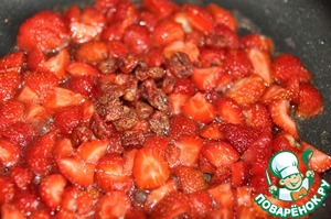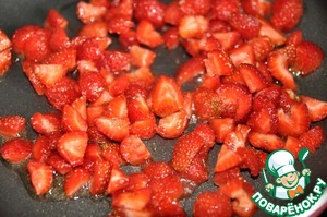 На сковороду наливаем оливковое масло, нагреваем, кладём 2/3 нарезанной клубники и тушим пару минут, помешивая лопаткой.