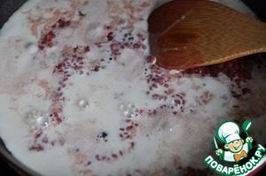 Начинаем наливать по полстакана молока, непрерывно помешивая рис. Варим на медленном огне.