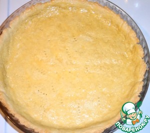 Распределите тесто по форме (у меня 27 см) и уберите в морозилку на 10 минут. В это время разогрейте духовку до 180 С. Достаньте тесто и проколите его вилкой в нескольких местах. Накройте тесто пергаментом и выложите на него сухие бобы. Поставьте форму с тестом в духовку на 15 минут. После этого снимите с теста пергамент с бобами и запекайте корж еще примерно 5 минут.