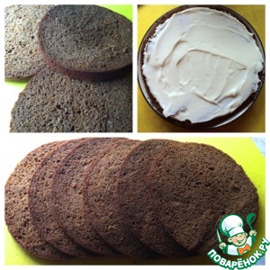Смазать каждый корж обильно кремом, поставить в холодильную камеру для пропитки.