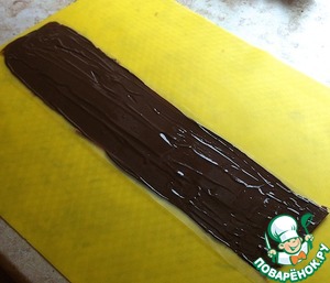 Для этого 100 г темного шоколада растопить на водяной бане, нанести средним слоем на полоску из плотного "файла" по длине окружности торта (у меня 2 полоски было), поставить в прохладное место для застывания, но не замерзания. Потом аккуратно поднести шоколадную полоску и приложить сразу к торту, при этом отсоединяя пленку "файла". -