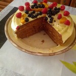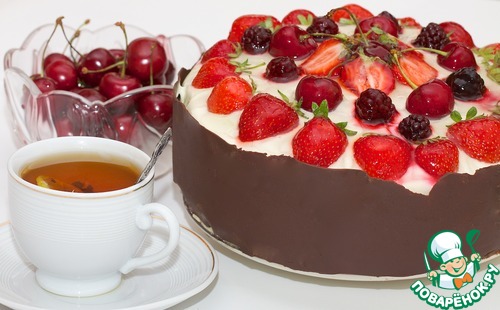 Сверху украсить торт сезонными ягодами по своему вкусу, приготовить желе для заливки как указано на упаковке и залить им ягоды, начиная от центра.