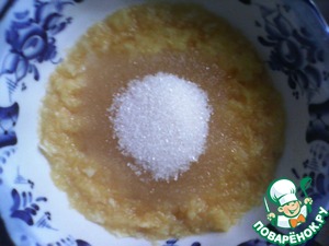 Моя же начинка практически без цедры, поэтому жидковата. Просто сливаем лишний сок (вот вам практически и фреш). Добавляем в начинку сахар, перемешиваем и убираем в холод.