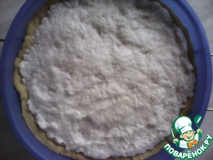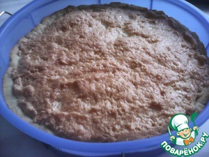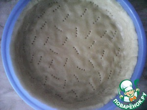 Форму для выпечки (у меня диаметром 25 см) ничем не смазываем. Выкладываем в нее тесто, формируем лепешку с бортиками. Накалываем тесто в нескольких местах вилкой и ставим в разогретую до 150-160 градусов духовку на 20 минут.