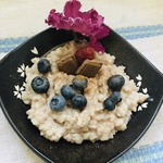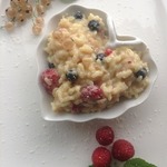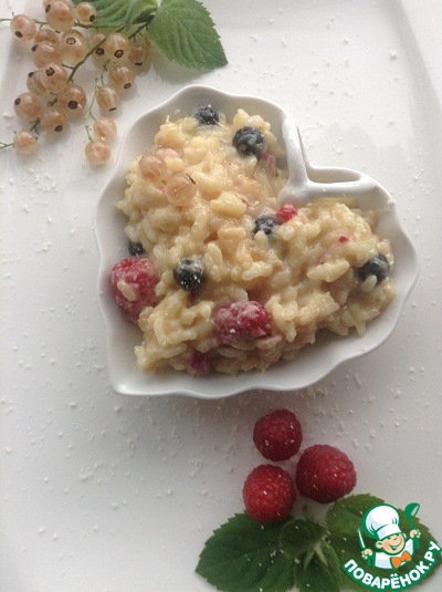 Разложите ризотто на десертные тарелки или в креманки и украсьте порции ягодами и шоколадной стружкой.