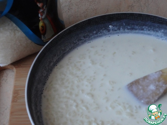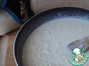 Подливая оставшееся молоко порциями по мере впитывания жидкости до тех пор, пока рис не станет очень мягким.