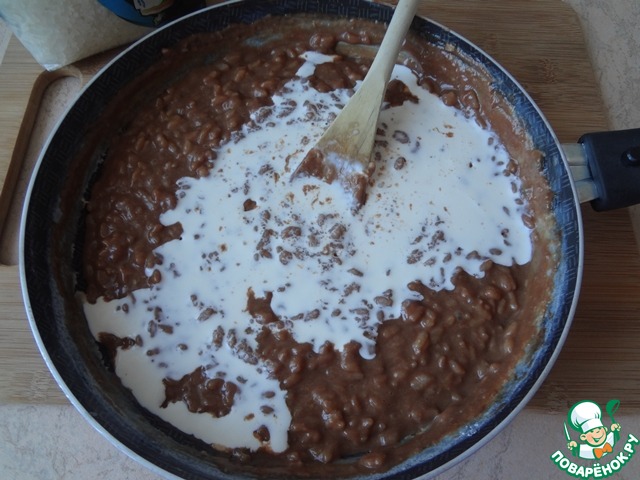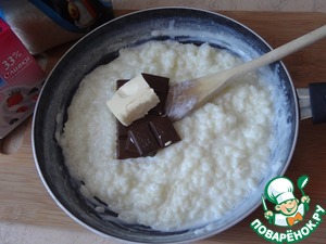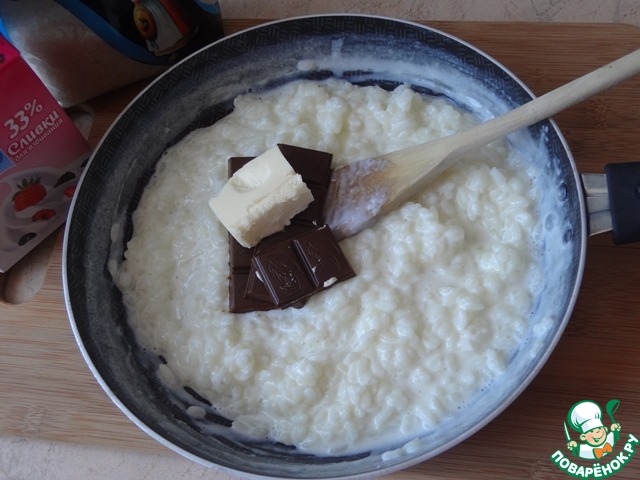 Шоколад разломайте на небольшие кусочки и, постоянно размешивая рис, добавьте в кастрюлю масло, и шоколад. Готовьте ризотто еще 1-2 минуты, постоянно помешивая, до тех пор, пока не растает весь шоколад.