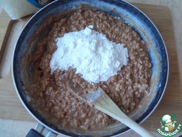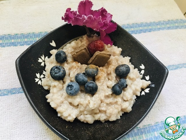 Вмешайте сахарную пудру берите кастрюлю с огня и добавьте корицу и сливки. Тщательно перемешайте ризотто, накройте кастрюлю крышкой и дайте постоять несколько минут.
