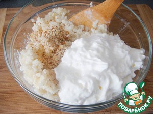 Перемешать остывший рис с миндальной крошкой и сливками.