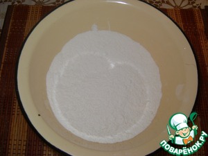 Смешать все сухие ингредиенты:муку, разрыхлитель, щепотку соли,1/2 ст. л сахара.
