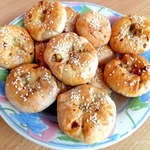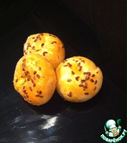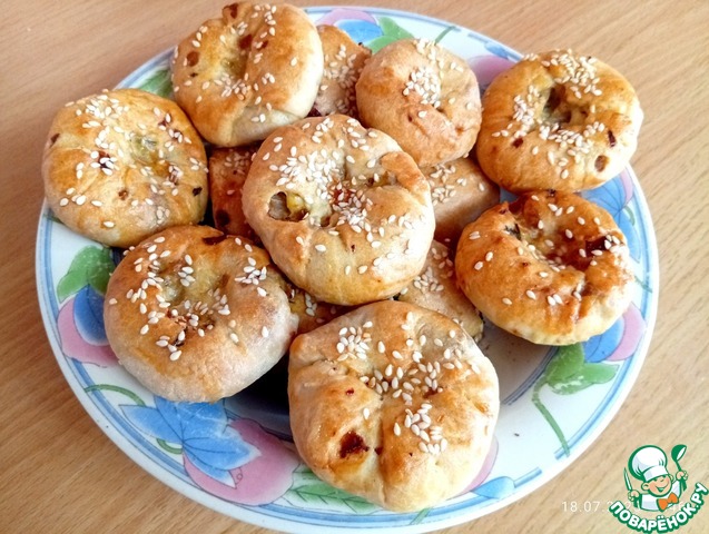 Выкладываем пирожки на противень, смазываем сверху сырым яйцом. По желанию можно посыпать сверху кунжутом. Отправляем выпекаться при температуре 180 градусов на 30 минут.