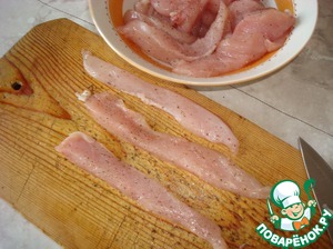 Филе курицы нарезать длинными тонкими полосками. Поперчить, посолить и отставить в сторону.