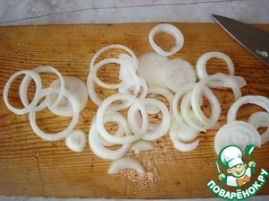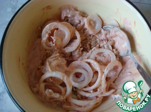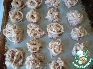 На следующий день начинаем готовить наши розочки. включаем духовку на 200 градусов для нагревания (градусы выставляйте с учётом особенностей вашей духовки). достаём из холодильника замаринованные куриные полосочки и начинаем творить. на смазанный маслом противень выкладываем скрученные куриные полоски в виде бутонов розочек. сверху выкладываем кольца лука из маринада и отправляем в разогретую духовку. ждём пол часа и готово.