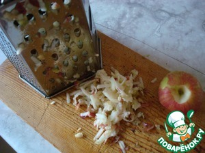 Добавить лук колечками и натёртые яблоки. И всё перемешать.