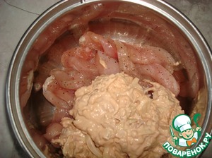 Куриные полоски соединяем с подготовленным маринадом, перемешиваем и оставляем мариноваться на ночь.