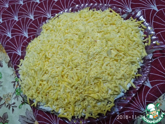 Укладывать слоями на широкое блюдо, каждый слой смазать майонезом: