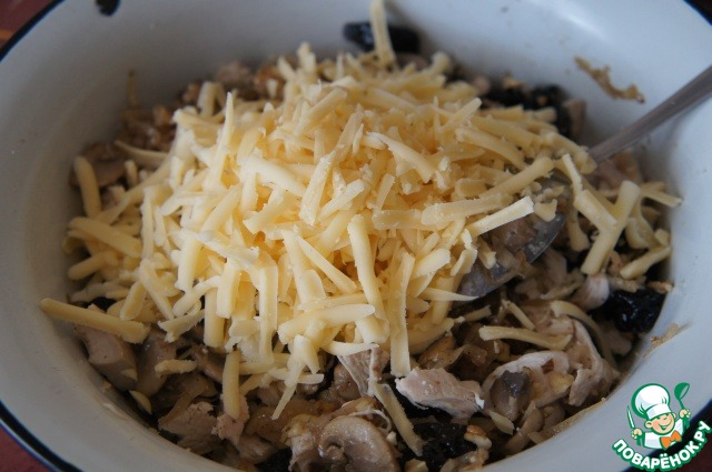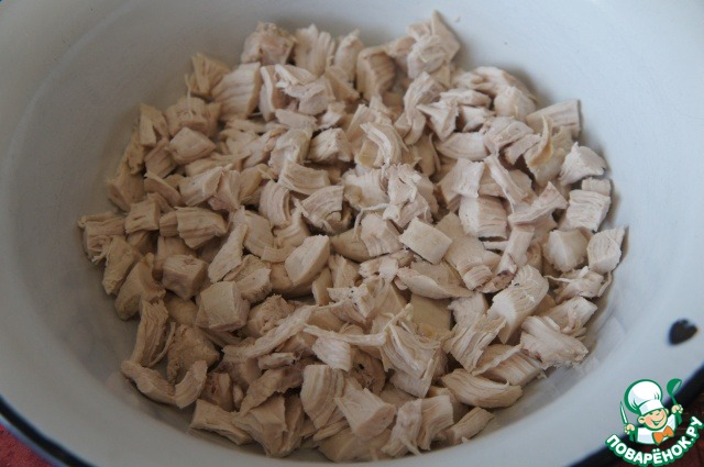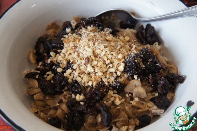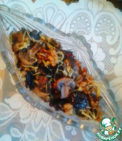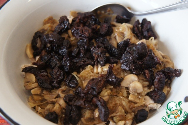Чернослив предварительно замочить, затем воду слить, а чернослив нарезать соломкой. Орехи измельчить средними кусочками.