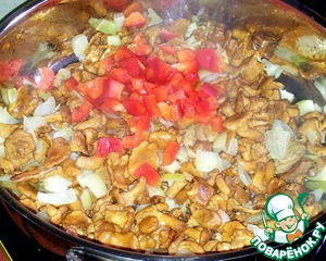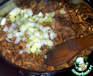 Не крупно нарезала лук и положила жарить в сковороду с лисичками.