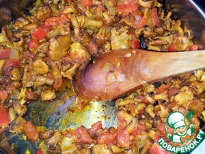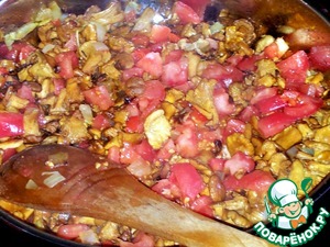 Помидоры ошпарила кипятком. Выдержала две минуты и очистила от кожицы. Нарезала и тоже переложила в сковороду жарить.