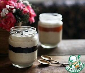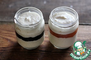 Выложить слоями в порционные формочки, сначала заполнить половину, сверху топпинг (у меня яблочное повидло и шоколад).