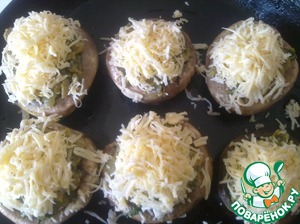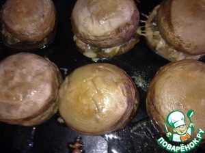 Накрываем начинку с сыром сверху оставшимися шляпками, укладываем на противень и запекаем при температуре 180 градусов в течение 10 минут.