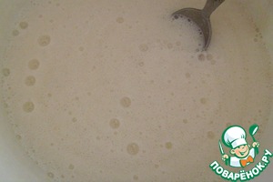 Добавляем к нашей заварной массе сахар, 2 стакана теплой воды (можно заменить сывороткой), дрожжи и оставляем в теплом месте минут на 15. В итоге должна получиться вот такая пенная масса.
