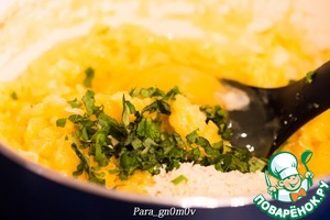 Мяту, миндаль, сливочное масло, сыр и яйцо добавить к чуть остывшему рису и тщательно перемешать. -