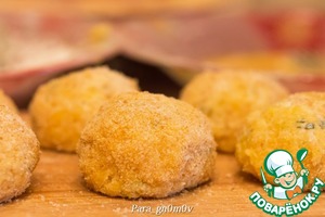 3. Сформировать из риса небольшие шарики диаметром около 5 см. Каждый шарик сначала обвалять в муке, потом обмакнуть в яйцо, затем обвалять в панировочных сухарях.