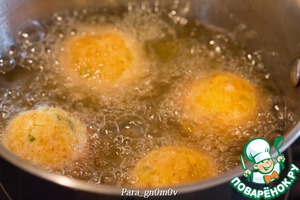4. Разогреть подсолнечное масло до кипения. В кипящее масло аккуратно опустить аранчини и обжарить до золотистой корочки. Можно запечь аранчини в духовке (при температуре 180 градусов), получится менее вредный (но и менее вкусный, на мой взгляд) вариант.