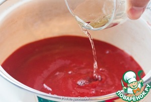 5. Пока готовится рис, клубнику с сахаром измельчить в блендере до однородности. Для большей однородности и пышности протереть клубнику сквозь мелкое сито. Добавить шампанское или вино и перемешать. Охладить.