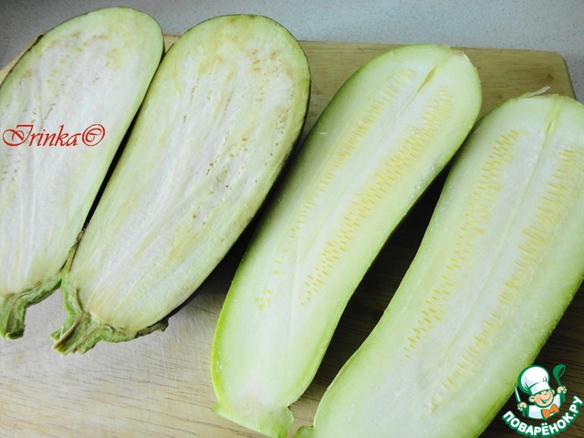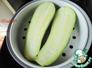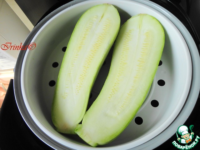 Кабачок моем, разрезаем вдоль пополам и варим в пароварке 10 минут.