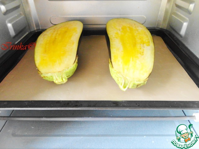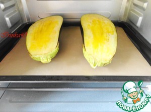 Баклажан кладем на противень, смазываем срез оливковым маслом и запекаем 25 минут до мягкости.