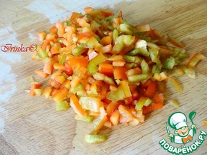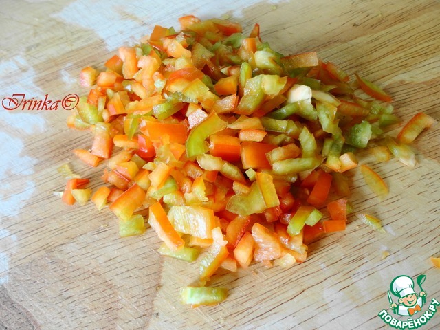 Сладкий перец режем мелкими квадратиками, подливаем столовую ложку воды и припускаем в микроволновке пару минут при полной мощности.