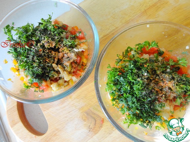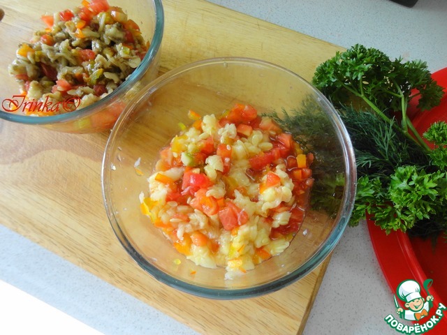 Зелень мелко рубим. Мякоть баклажана и кабачка измельчаем, смешиваем в разных мисочках с помидорами, перцем, зеленью и давленым чесноком. -