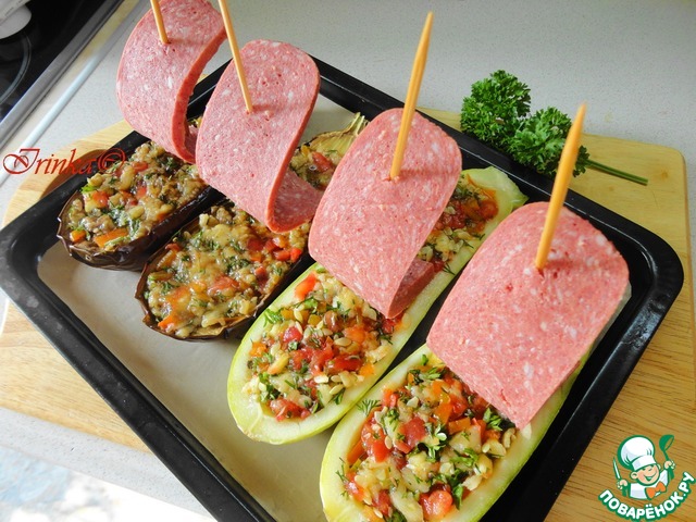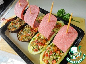 Колбасу нарезаем на тонкие пластинки прямоугольной формы, надеваем на шпажки (шпажки надо обрезать наполовину!) в виде паруса и втыкаем в кораблики. Если паруса будут падать - опустите нижний край прямо в овощную смесь! Запекаем при температуре 190-200 градусов 10-15 минут, до зарумянивания колбаски.