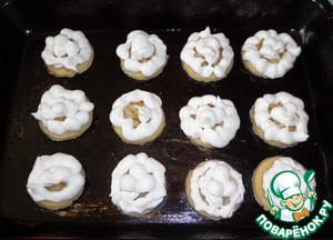 Белки взбиваем с 0.5 стак. сахара в крепкую пену. С помощью кондитерского шприца красиво выкладываем белки поверх груши.