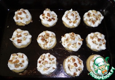 Отделить желтки от белков. Желтки взбиваем с 0,5 стак. сахара и добавляем к муке с маргарином. Перемешиваем хорошенько. Замесить тесто, чтобы легко раскатывалось.