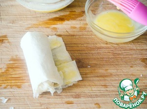 Растопить сливочное масло и подготовить один желток для склеивания рулетиков. Лист теста выложить на разделочную доску и обильно промазать сливочным маслом. Тесто должно быть буквально полностью пропитано растопленым маслом. С одного края положить ложку начинки, подогнуть бортики вдоль всего листа теста и скатать в рулетик.