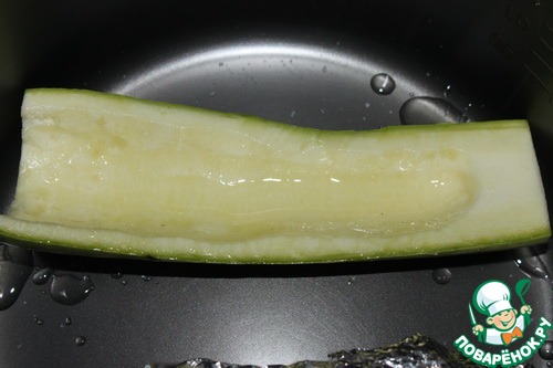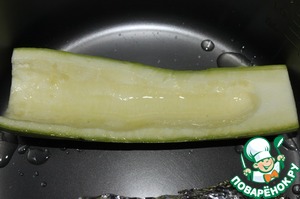 Кабачки вымыть, разрезать вдоль пополам. Ложкой убрать мякоть, сделав "лодочки". Посолить, сбрызнуть растительным маслом.