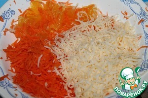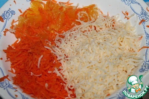 Апельсин очистить, разобрать на дольки, убрать пленки и нарезать кусочками. Морковь вымыть, очистить, натереть на мелкой терке. Сыр также натереть на мелкой терке.