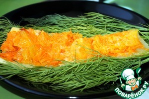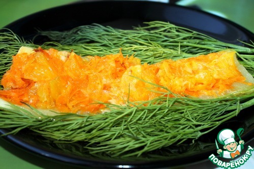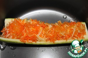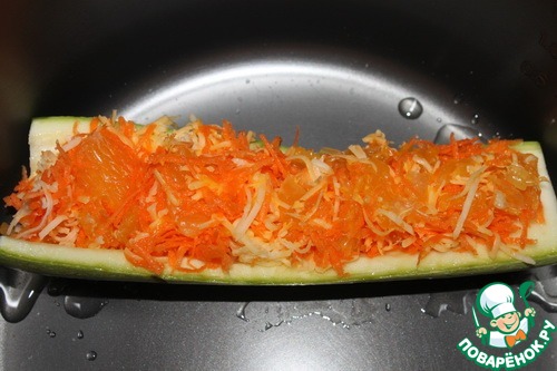 Морковь, апельсин и сыр перемешать. Нафаршировать получившейся смесью кабачки. Чуть-чуть полить маслом.