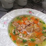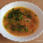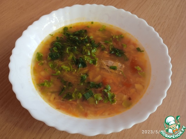 Суп едят с вареным мясом и свежей зеленью. Зелень (кинза, реган, зеленый лук, петрушка, укроп и т. д. по вкусу) режется отдельно и добавляет каждый сам себе в тарелку.