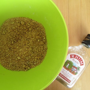 Орехи (100 гр) смешать с панировочными сухарями (50 гр), разрыхлителем (1 пакет) и ромом (1 ст. л.).