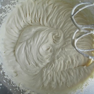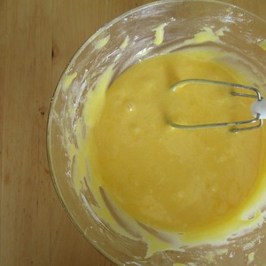 Яйца (3 шт) разделить на белки и желтки. Желтки растереть с сахарной пудрой (140 гр) и добавить к предыдущей смеси. Получится густое тесто.