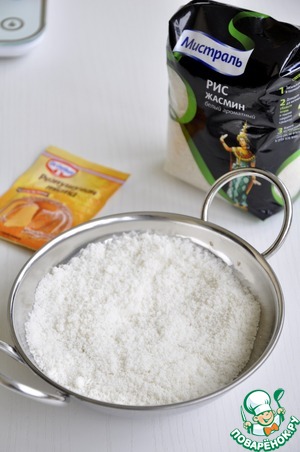 Смешать молотый кокос (или стружку) с рисовой мукой, добавить разрыхлитель.