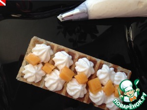На первую вафельку из кондитерского мешка выкладываем немного крема, посыпаем кубиками манго, накрываем второй вафелькой и так до конца. В каждой порции у меня по 4 вафельки.