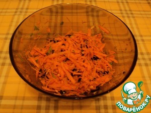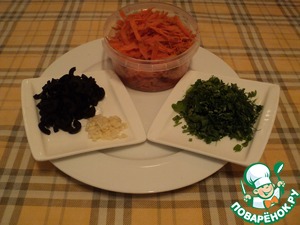 Подготавливаем продукты для начинки рулетиков. Натираем морковь на средней тёрке, нарезаем маслины полукольцами, мелко режем зелень (часть откладываем), раздавливаем и как можно мельче режем чеснок.