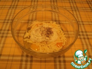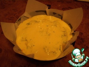 Смешиваем все ингредиенты для заливки: яйца, сыр, сметана, зелень. Солим, перчим по вкусу.