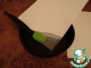 Укладываем пергаментную бумагу в форму для выпекания. Если нет пергаментной – вполне подойдёт обычная, формата А4, хорошо промасленная.