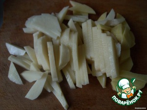 Варим бульон. В готовый кипящий бульон заложить капусту, проварить и заложить картофель. -